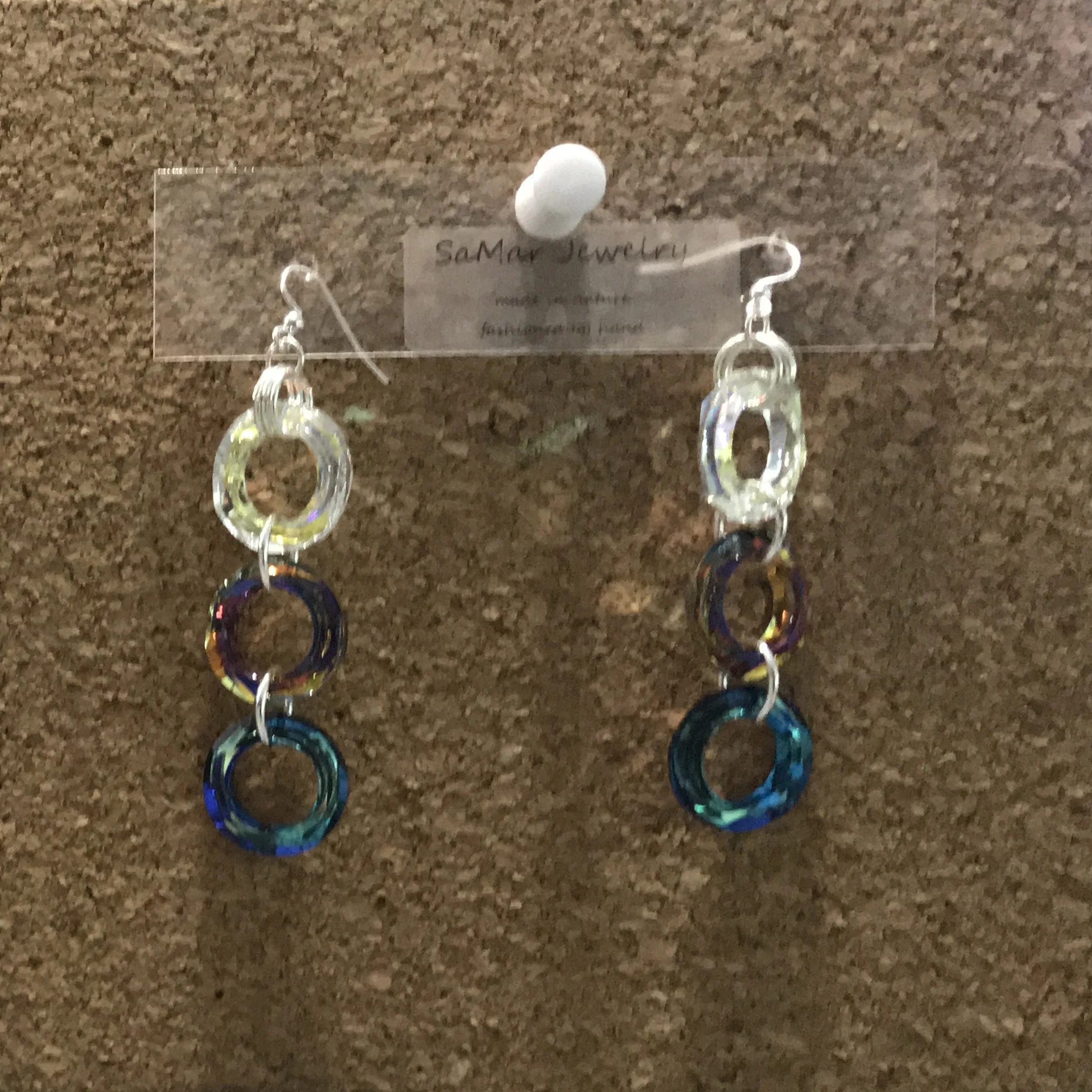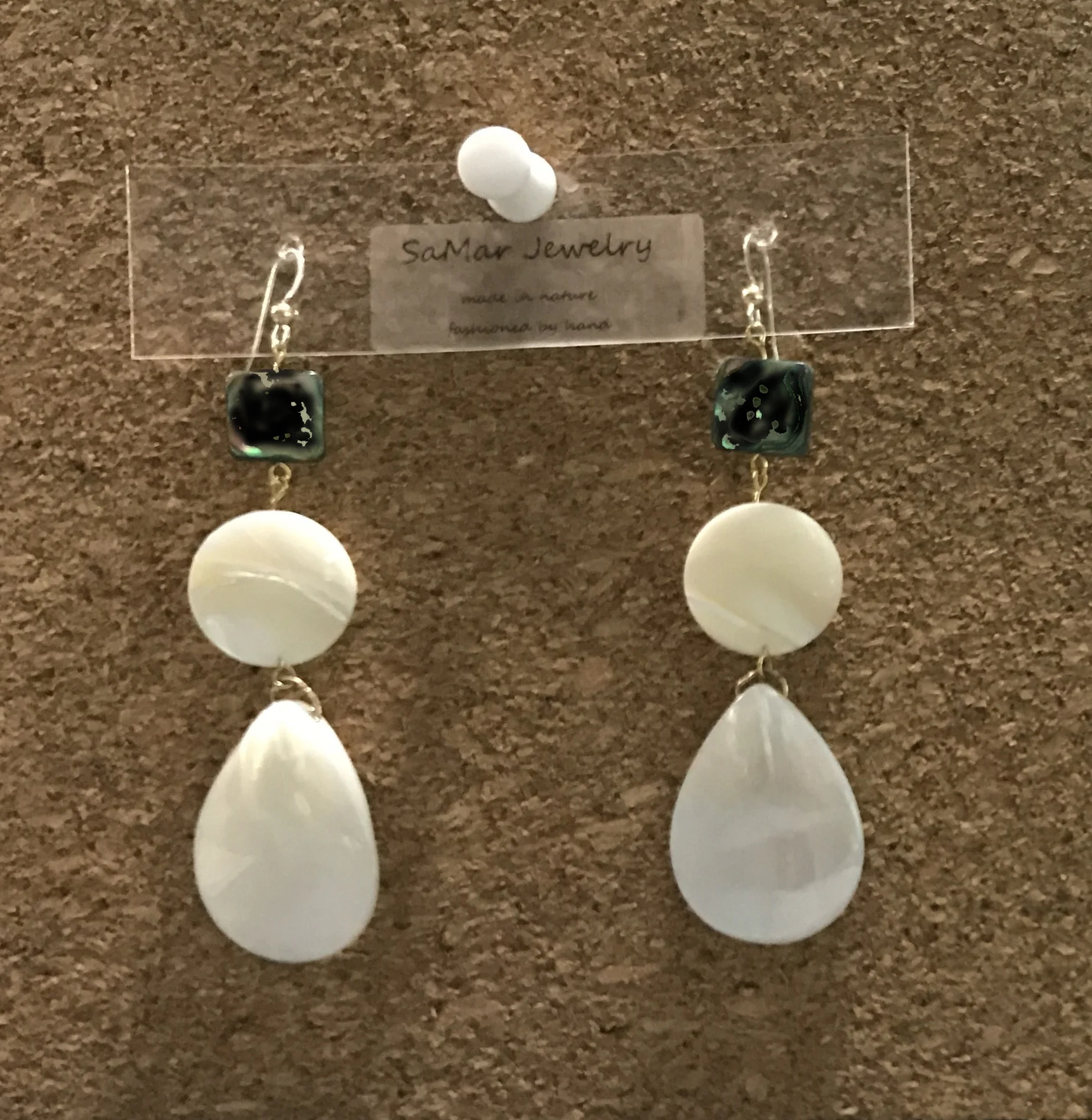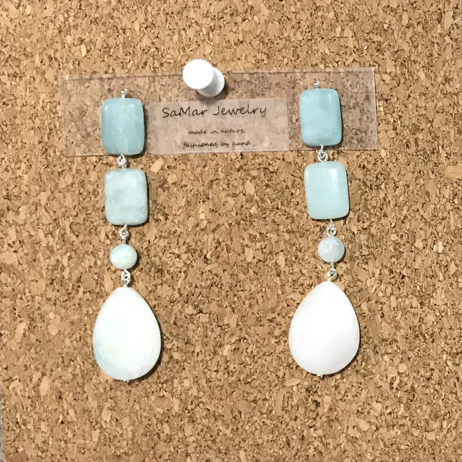 3 1/4" Mother of Pearl and Shell + 2 3/4" Swarovksi Crystal + 3 1/8" Long all Chalcedony with top Amazonite  Other designs upon request.  Please email at samossblad@verizon.net.